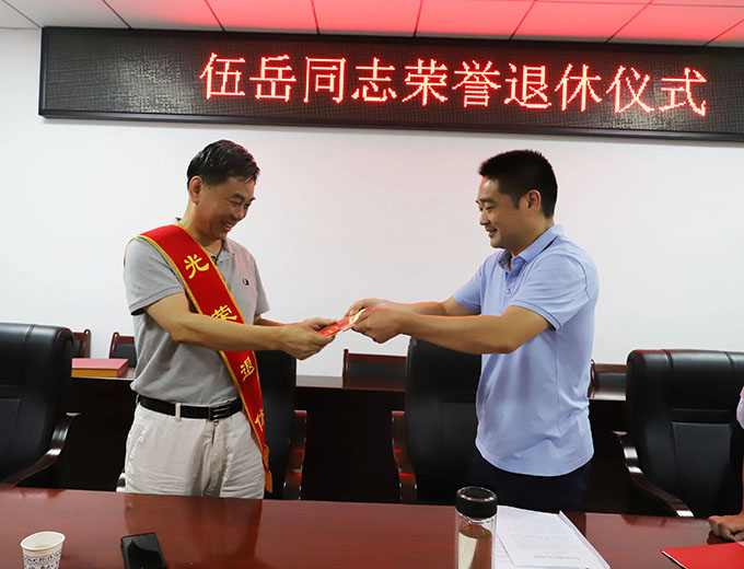 儀式上,董事長陽文林為伍岳同志佩戴了“光榮退休”綬帶,頒發(fā)了“光榮退休”紀念牌,并代表集團公司向伍岳同志為萬寶投各項事業(yè)發(fā)展所作出的貢獻表示崇高的敬意和衷心的感謝。總經(jīng)理徐業(yè)波傳達了相關(guān)文件精神,介紹了退休同志有關(guān)情況,回憶曾經(jīng)與伍岳同志共同奮斗的情誼和榮耀。工會代表在座談會上表達了感恩與不舍的心情,并送上了溫馨的祝福。